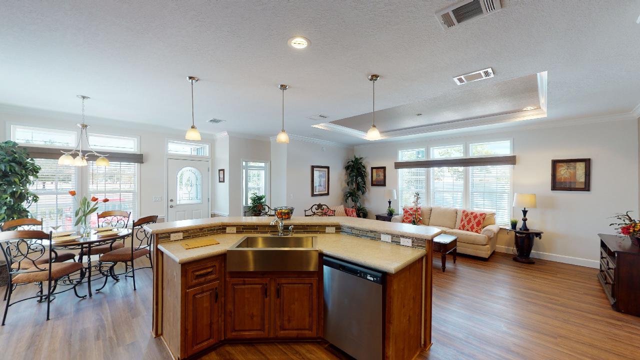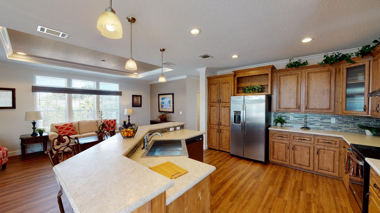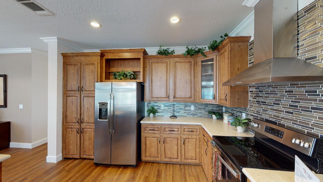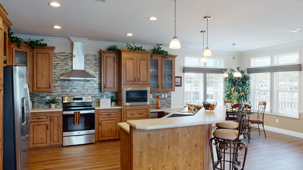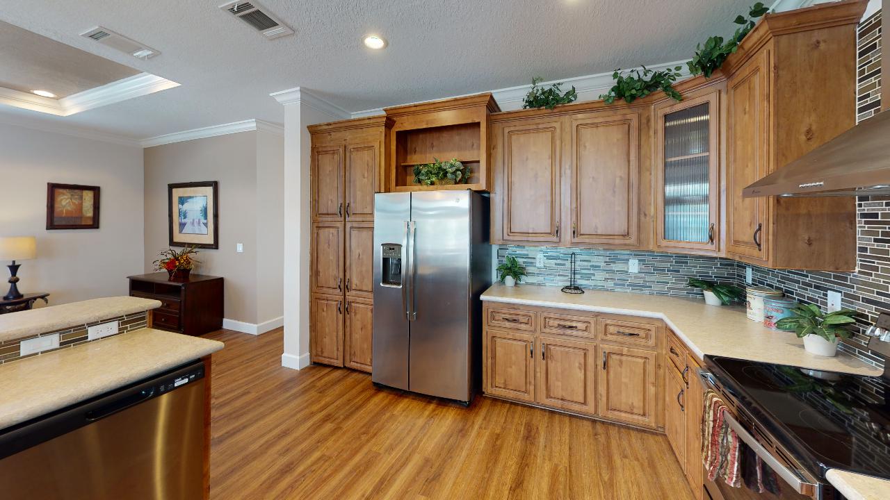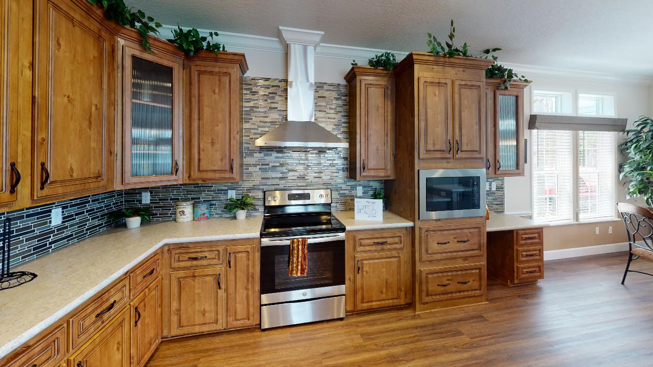 Elegant, off-set inviting covered porch entry into the open concept floor plan, crown molding with an abundance of large windows, showcasing natural, LED recessed lighting, a 5-arm chandelier, and a beautiful tower vault ceiling accent. Enjoy entertaining and/or cooking in the beautiful stainless-steel kitchen, (featuring GE appliances) extra-large center island workstation/breakfast bar, desirable countertop space and custom wood cabinets (42”), surrounded by a panoramic modern tile glass deco backsplash.
