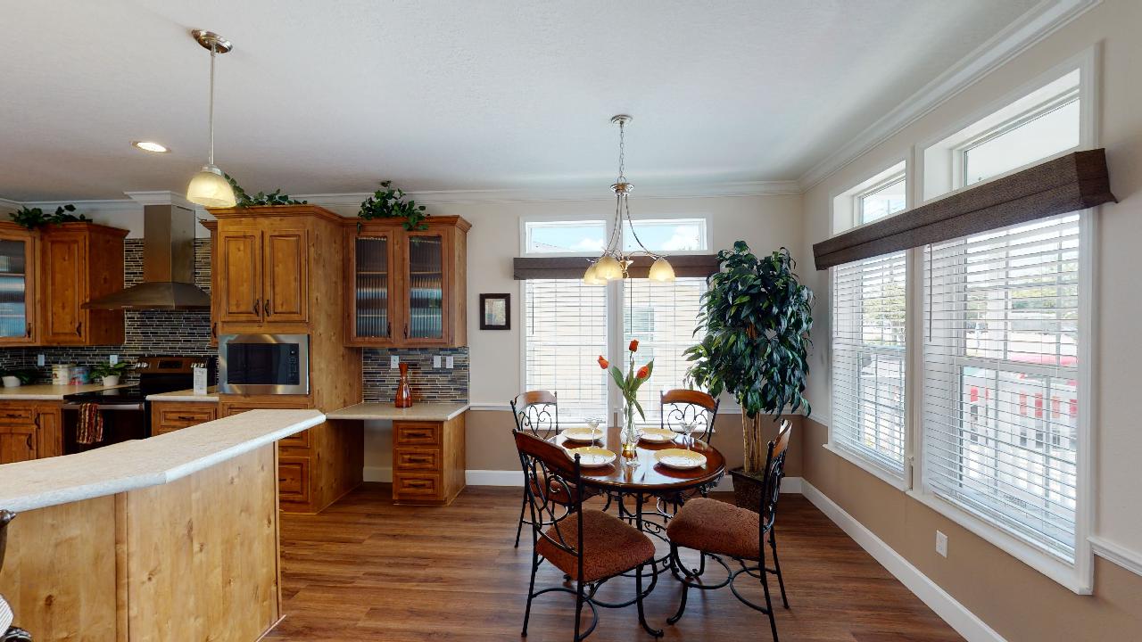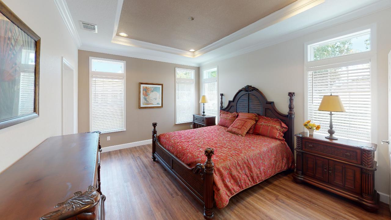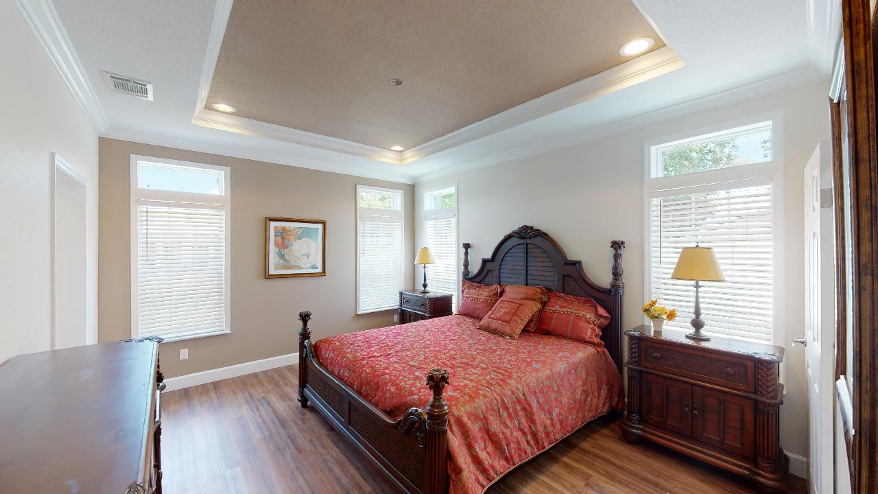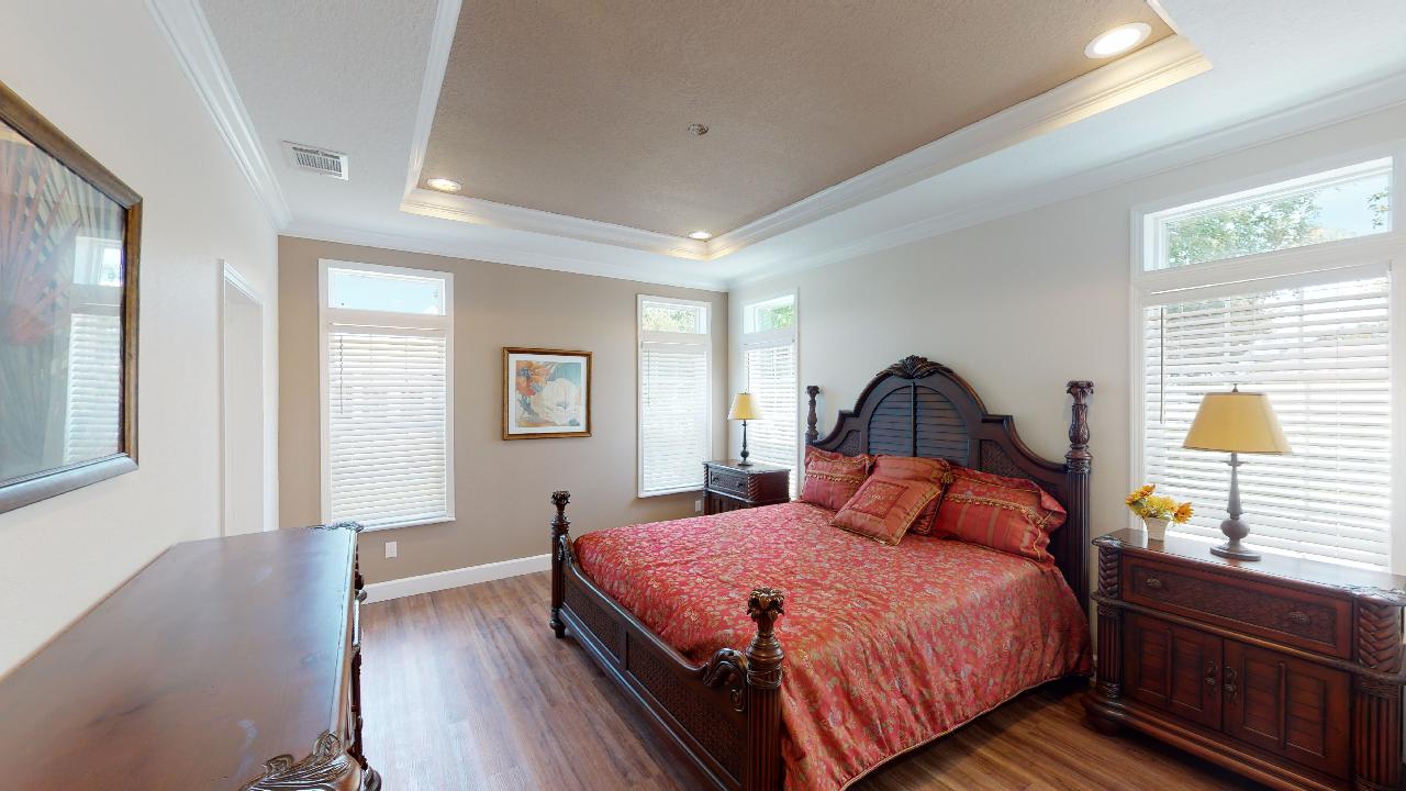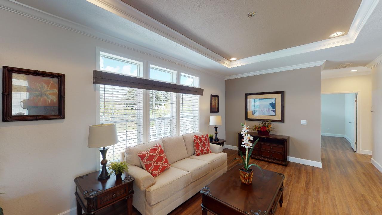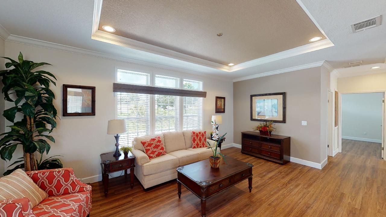 Elegant, off-set inviting covered porch entry into the open concept floor plan, crown molding with an abundance of large windows, showcasing natural, LED recessed lighting, a 5-arm chandelier, and a beautiful tower vault ceiling accent. Enjoy entertaining and/or cooking in the beautiful stainless-steel kitchen, (featuring GE appliances) extra-large center island workstation/breakfast bar, desirable countertop space and custom wood cabinets (42”), surrounded by a panoramic modern tile glass deco backsplash.